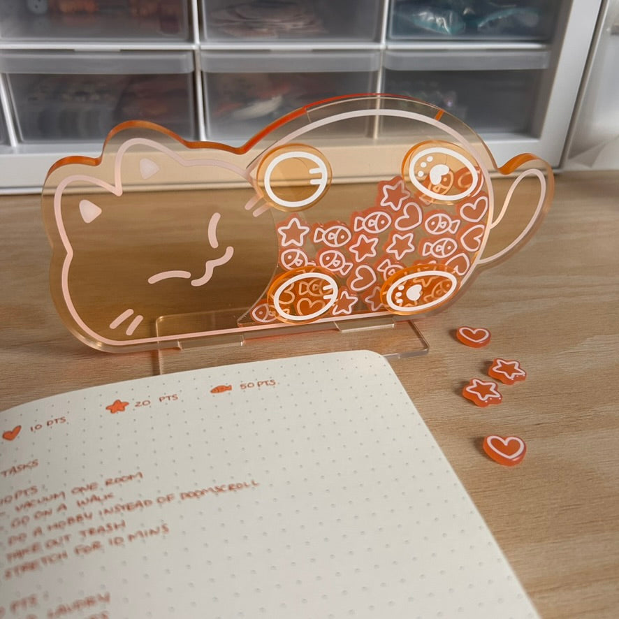 The set comes with a kitty standee with 3D paws along with 31 charms (3 styles: fish, star, and heart). Allowing multiple ways of usage, whether tracking days of the month or your own custom system.
